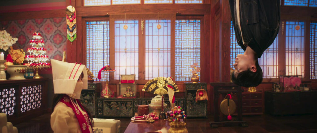 Why college? Because it lets her pretend, even briefly, that she’s just another girl navigating adolescence instead of battling curses. Sung-ah yearns for dates, drama clubs, and dreamy guys. So when fate drops Bae Kyun-woo (Choo Young-woo) into her shrine one day, looking like he stepped out of a skincare commercial, she’s understandably smitten. That is, until she realizes he’s literally walking upside down in the spirit world.