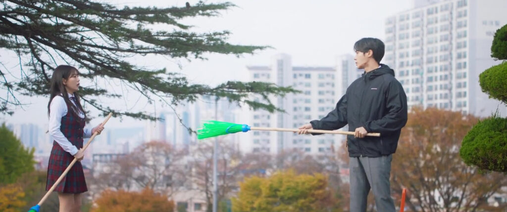 Things get juicier – and wetter. Sung-ah has a vision of Kyun-woo drowning, and lo and behold, she finds a water ghost chilling in the boys’ bathroom. Attempting to negotiate, she offers the ghost alternatives. The spirit, however, is thirsty for Kyun-woo’s misfortune. Enter: water-hose exorcism. Picture this: a shaman girl blasting spirits with holy water in a boys’ bathroom. Predictably, the school sees a deranged stalker, not a heroic act. Both she and Kyun-woo are punished, and he sternly tells her to stay away.