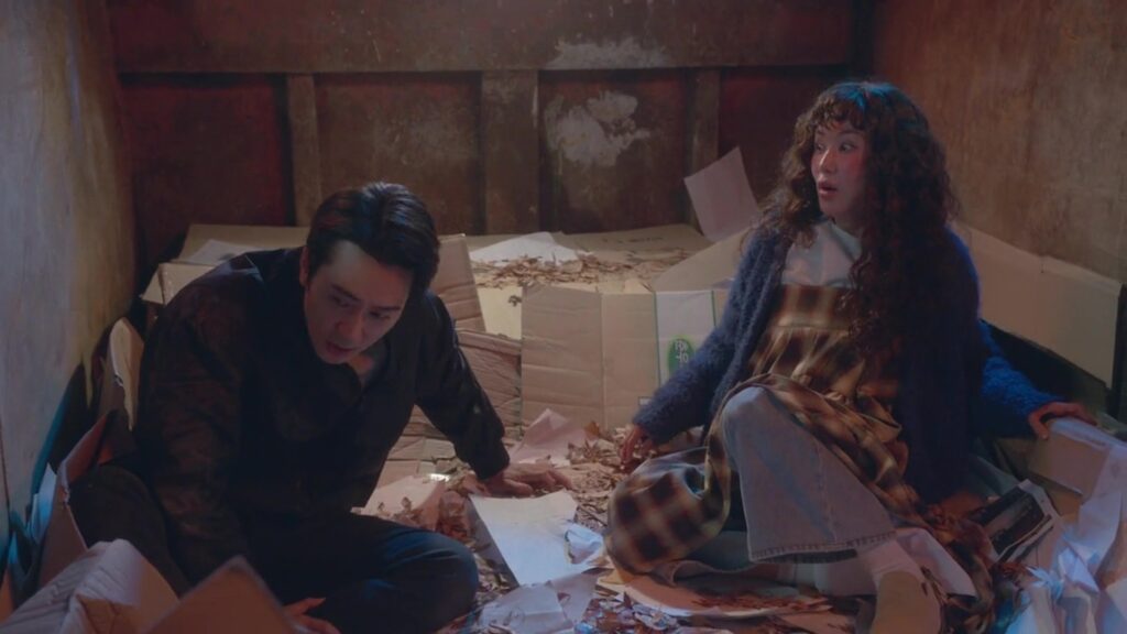 Threats bubble. There’s a hint of darker forces. Se-ra’s former manager, Kang Doo-won, has become an agency CEO. He’s now tied to Se-ra’s old rival, Go Hui-yeong, who got the role Se-ra rejected and subsequently rose to fame. Doo-won appears to be blackmailing Hui-yeong. Suspicious truck drivers lurk near Se-ra’s residence. A settlement meeting with a driver who might wish her harm goes sideways. The episode closes with Se-ra hiding from a would-be knifer. That cliffhanger jokes with genre and then dares you to care.