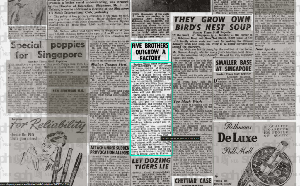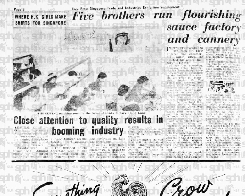 | First Singapore factory | The family set up the Yeo Hiap Seng sauce factory in Singapore in the 1930s. |