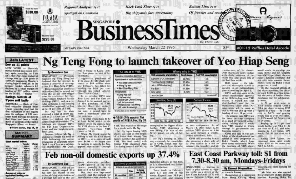 Once unity cracks, vultures circle. Not literally, but close: property heavyweights noticed YHS’s land in Bukit Timah. With the Yeos divided and their holdings fragmented, buying a controlling stake became doable. Orchard Parade Holdings — backed by Ng Teng Fong’s group — slowly accumulated shares on the open market. By 1995, after a ferocious battle for control, the Ng family emerged the winner.