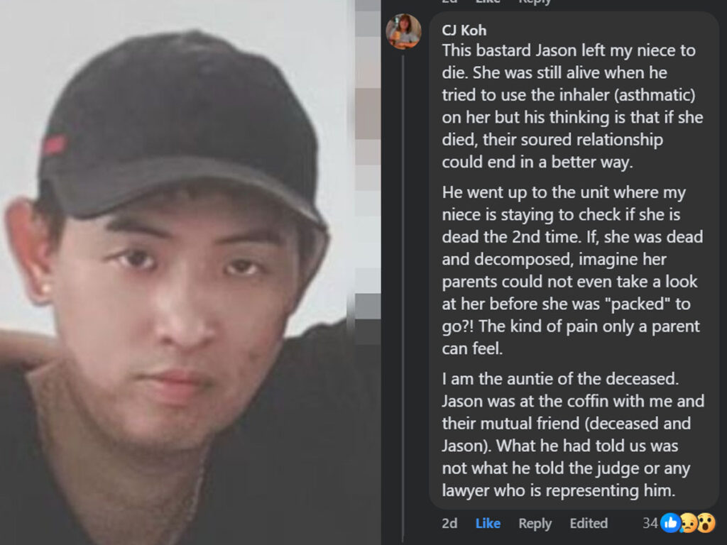 Things became even more emotional when a Facebook comment, reportedly from a relative named “CJ Koh,” surfaced online. According to the comment, the family believes Jason left the woman when she was still alive. They claim he went back again later just to check if she had died and waited for her body to start decomposing before anyone found her.