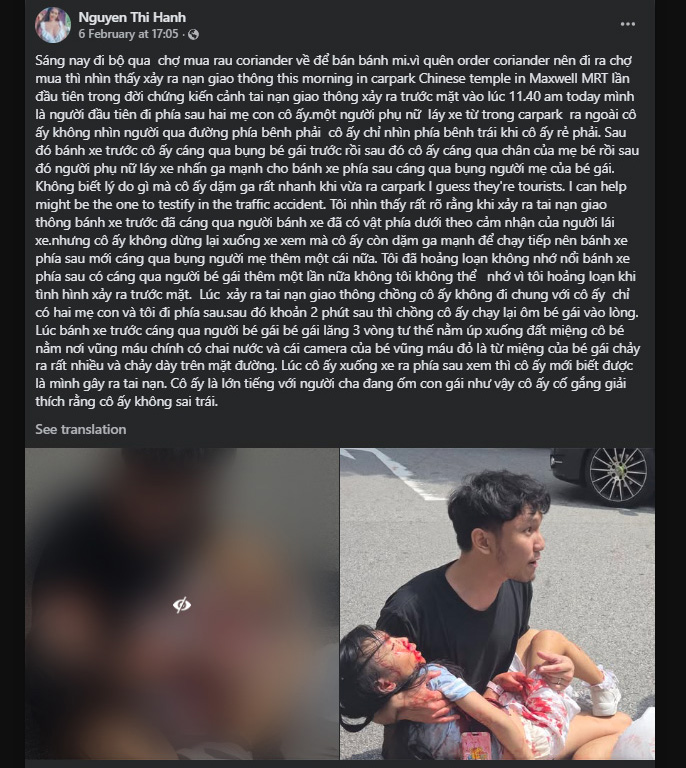 Eyewitnesses say a dark-coloured BYD car was exiting a car park near a Chinese temple by Maxwell MRT. The car was making a right turn when it struck the mother and daughter as they crossed.